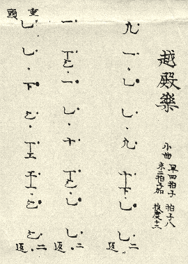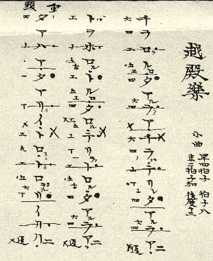 左の写真は、「なんじゃ、こりゃ?」なんて思う方が多いと思いますが、「越天楽」という曲の笙の譜面です。