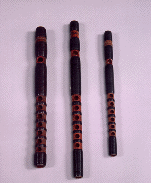 雅楽の横笛には3種類あります。写真左から、龍笛(りゅうてき)、神楽(かぐら)笛、高麗(こま)笛です。ここで紹介する龍笛は、主に唐楽を奏でるときに用います。